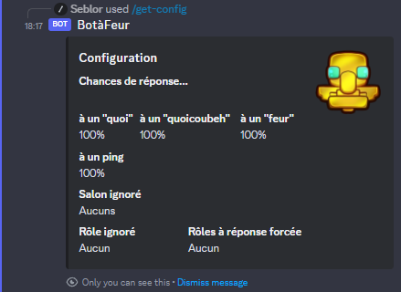 * Il est possible de changer la chance de réponse du bot sur chaque élément déclencheur (par exemple, si la chance de réponse est de 50%, le bot répondra une fois sur deux à un message "quoi ?"). Les déclencheurs sont :